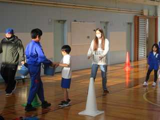 そして、3つのブースに分かれて体験活動を行いました。大声チャレンジ、防災ジェスチャー、ぴったり土嚢入れです。