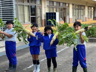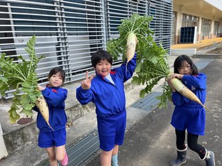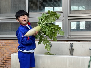 12月1日(月)1,2年生が大根を収穫しました。お天気に恵まれた月曜日の1限に大きくなった大根を収穫しました。