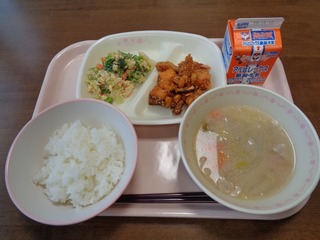 帰ってきた鮭のケチャップソースがらめ、アスパラ菜のたまごあえ、心ほっこり酒かす汁、糸魚川産コシヒカリのご飯、牛乳です。
