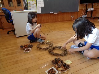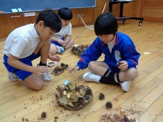 松ぼっくり、どんぐり、赤くそまった紅葉など、思い思いに選んだものをリースに付けていきました。