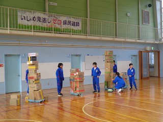 3,4年生が箱を作り、1,2年生が箱を運び、5.6年生が箱をソリに積んで、ゴールまで運ぶというゲームです。