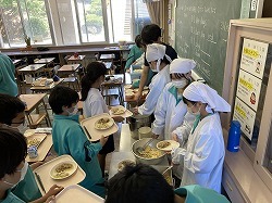 1年生は入学してから2か月が経ちました。中学校生活にも慣れてきて、いろいろな活動をスムーズに進めることができるようになってきました。写真は給食準備の様子。4限が終わってから食事の開始までは15分間です。給食当番だけでなく、クラス全員が協力をして手際よく配膳をしていました。
