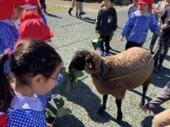近くの幼稚園の年長さんを招待して、羊を紹介することにしました。幼稚園に連絡をしてみたところ、嬉しいことに、年長さんだけでなく、年中さんと年少さんも一緒に来てくれました。日々のお世話の中で知った羊の「みつくん」や「すずちゃん」のことを伝えたり、一緒にグラウンドまで散歩をさせたりしました。「羊さん、かわいかった」「さわれたよ」と感想をもらって、1年生も嬉しそうにしていました。帰る時には、1学期から育ててきた花の種をプレゼントしました。