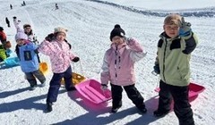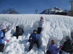 スキー場では、そりあそびと雪あそび(鬼ごっこ、リレー、雪積み)を楽しみました。そりでは、最初は、坂の高さやすべった時のスピードにびっくりし、慎重にすべったり、こわごわすべったりしている様子でした。しかし、回数を重ねるごとに慣れていき、最後には、見ている大人がハラハラするくらいのすごいスピードですべりおりていく子や、遠くまでひっくり返らずに進める子がたくさんいました。雪あそびは、いつもとは違う状態での鬼ごっこやリレー。雪に埋まって、うまく走れないこともありましたが、それも楽しかったようで、大笑いしながら走り回っていました。雪積みでは、それぞれのチームが作戦を立て、協力しながら少しでも高く雪を積めるように頑張っていました。