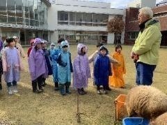 11月21日(金)の昼休みから、羊さんの卒業式を行いました。卒業式は、子どもたちがやりたいことをあげ、いろいろな内容を準備していました。しかし、当日はあいにくの雨。そのため全員かっぱを着ての卒業式になり、内容も短縮しながらの実施になりました。