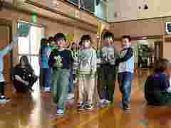 2年生の子に手を引かれて1年生が講堂に入場すると、全校から温かい拍手が起こりました。会の中では、自己紹介や爆弾ゲーム、学校紹介の劇などがあり、とても楽しい時間となりました。