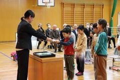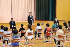 本年度は、1年生がいません。そこで、子どもたちに進級の喜びと新たな年度へ希望をもってもらうために、地域の方々をお呼びして、新任式、始業式を行いました。