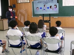 スライドや動画を使い、低学年にも分かりやすく伝えていました。