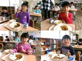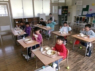 13日(月)から1年生の給食が始まりました。先週から「食べたいなあ」と言っていた1年生たち。待ちに待った給食です。2年生のお手本のおかげで、手洗いや身支度、配膳など準備もスムーズにできました。