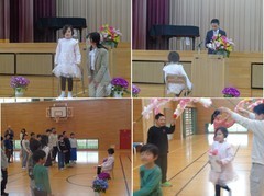6年生の伴奏に合わせて、みんなで児童会歌を歌いました。最後は、同級生たちと花のアーチをくぐって教室に行きました。もうすでに仲良しになっていました。