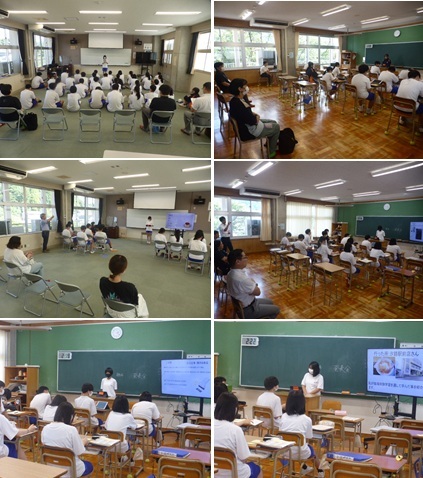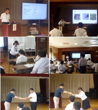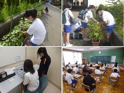 当校からは1年生2名の生徒が参加し、夏休みの理科の課題で行った研究の成果を発表しました。「ペットボトルで太陽熱温水器をつくろう」「暑い外で食べ物を干してみよう!」が2人の研究テーマです。ペットボトルの色の違いによる水温上昇の変化をグラフを使って分かりやすく結果にまとめてくれていました。また、りんごやバナナ、にんじん、玉ねぎなどの果物や野菜を炎天下に3日間乾燥させ、その形や色の変化など調べました。実際の乾燥させた果物や野菜を参加者が手に取って観察場面もあり、好評でした。研究の内容はもちろんですが、堂々と自分の考察を述べるなど発表も素晴らしかったです。