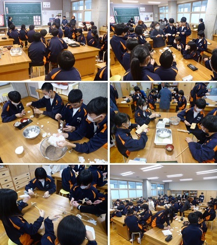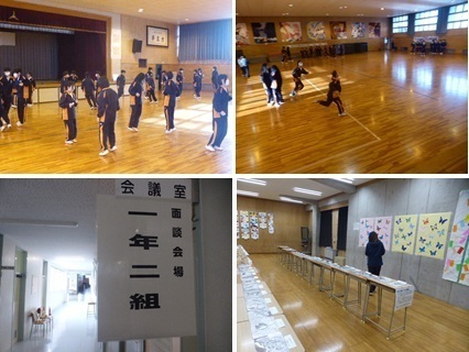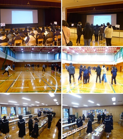 12日(金)、2学年の親子活動を実施しました。前半は、来年3月に予定している修学旅行のねらいや行程等について説明を行いました。また、旅行先に関する〇×クイズも実施し、親子で一緒に考えながら名所などについて楽しく学びました。後半は、親子混合でドッヂビー(ボールの代わりにフリスビーを投げる)を行いました。あちこちでハッスルプレーが見られ、笑顔あふれるひとときを過ごしました。雪が舞う日となりましたが、御参加いただいた保護者の皆様、PTA役員の皆様、ありがとうございました。放課後には、学習成果の展示を代表生徒と職員で行いました。1・2階の多目的教室には、これまでの授業等で取り組んできたさまざまな成果物が整然と並べられ、掲示されました。早速、今朝の朝活動の時間に1年生が各教室を回り、鑑賞しました。発想力豊かな力作ぞろいですので、明日から始まる期末面談の際にぜひお立ち寄りください。