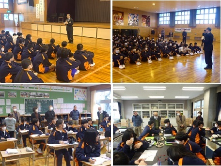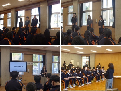 19日(金)、1・2年生合同集会を開催しました。次年度の生徒会組織づくりに向けた内容で、新二役からは、目指す学校像や公約の再確認が行われ、協力してほしいことや積極的な参加を呼びかける熱い思いが伝えられました。また、現総務委員や専門委員長の3年生からは、活動内容ややりがいが語られ、よりよい学校づくりをしっかり引き継いでほしいというエールが送られました。新総務委員・専門委員長選出に向けた面接は、新年1月に実施予定です。同日、3年生のKYB活動を行いました。糸魚川市教育委員会スクールソーシャルワーカーの細井 広子 様を講師にお迎えし、「自分との向き合い方」をテーマに御講演いただきました。受検を控える3年生にとって、まさに「自分事」となる内容で、生徒たちは大きくうなずきながら、真剣にメモを取り、話に耳を傾けていました。講演を参考に、これからの数か月、自分と上手に向き合って過ごしてほしいと思います。