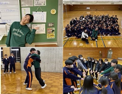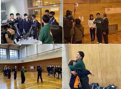 収録では、大の里関の手形はもちろんですが、能生中の特色ある教育活動や生徒会の目標であるSNGsなどについても校長先生から紹介していただきました。この日はちょうど3年生のPTA親子活動もあり、おばたのおにいさんのご厚意で、収録の合間にはフリースロー競技などに一緒に参加してくださいました。生徒たちが大喜びだったのはもちろんですが、写真撮影などお家の方も盛り上がっていました。放課後には、おばたのおにいさんから生徒たちにインタビュー等があり、特設相撲部の生徒と相撲対決などもしてくださいました。貴重な体験をさせていただきましたおばたのおにいさん、吉田アナウンサーさん、本当にありがとうございました。
