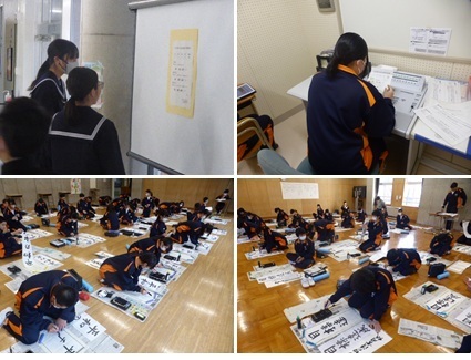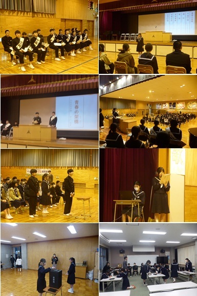 演説会終了後に各階の多目的教室で投票が行われ、当日開票されます。明日には生徒玄関ホールに当選者が告示されます。12/24(水)には市内4中学校の新生徒会役員が市内中学校に集まって生徒会交流会が行われることとなっています。来学期に行われる任命式後に、現生徒会総務委員から新役員へとバトンが渡されます。