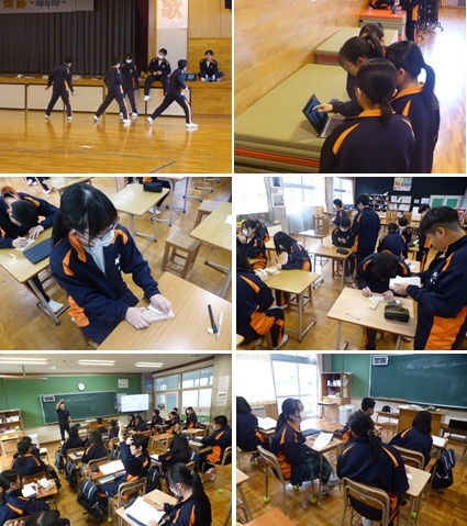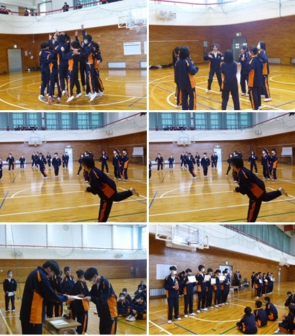 終業式後は学活で通知表を手にし、さらにその後は、延期になった球技大会(男女別学級対抗ドッヂボール大会)を行い、2学期を締めくくりました。珍プレーあり、好プレーありで白熱した試合を繰り広げました。競技のほかに「円陣大賞」なるものもあり、試合前からムードも最高潮で楽しいひと時となりました。体育委員の皆さん企画・運営ありがとうございました。2学期が無事終了を迎えられるのは、保護者・地域の皆様、関係機関の皆様の御理解と御協力、そして温かな見守りあってのことです。感謝申し上げます。今後ともよろしくお願いいたします。