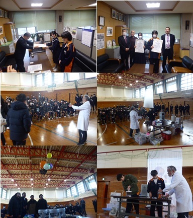 同じく12/18(木)の5・6限に全校合同理科授業が行われました。授業をしてくださったのは、非常勤講師として能生中2年生に理科を教えてくださっている水野敏明先生です。水野先生は、校長先生をご退職された後、69歳で気象予報士の資格を取られた経歴をもつ「天気」のスペシャリストです。