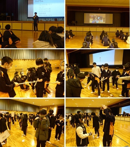 22日(月)に総務委員の3年生が企画した「年末大感謝祭」を実施しました。これまでの生徒会活動を振り返り、支え合った仲間に感謝し、3学期に向けさらに意識を高めようというものでした。振り返りスライドや縦割り班でのレクが行われ、大いに盛り上がりました。レクを進める中で生徒会長から「この企画のもう一つのねらいは、2年生が今後リードしていくことを意識してもらうこと」と話がありました。代替わりする生徒会の引継を「全校で意識しよう!」と、先を見据えたとても素晴らしい活動でもありました。3年生の総務委員の皆さん企画・運営ありがとうございました。