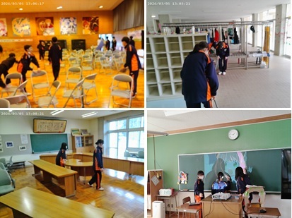 明日の卒業式に向けて、午前中に予行練習を、午後は会場準備等を行いました。先週一度だけの全校練習、どうかな?と思いましたが、全体によい緊張感と集中力を保ち予行練習を終えました。全校で所作がそろう瞬間は、1年間の集団としての成長が感じられます。午後は、1・2年生が協力して卒業式の会場準備等を行いました。3年生への感謝の気持ちを込め、運んだり、清掃したり、描いたり。一生懸命な姿が印象的でした。