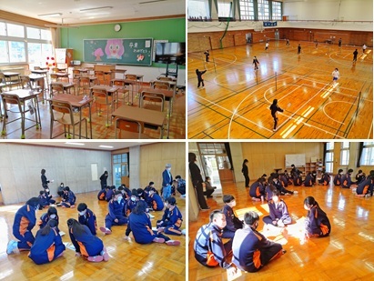 誰もいない3年生の教室を覗くと寂しさを感じますが、1・2年生はすでに次の目標に向けて、学校生活を送っています。1年生の保健体育では、バドミントンの試合を行っていました。まだ肌寒さを感じる気候ですが、半袖でプレーする生徒も。何事にも一生懸命に取り組む姿が印象的です。
