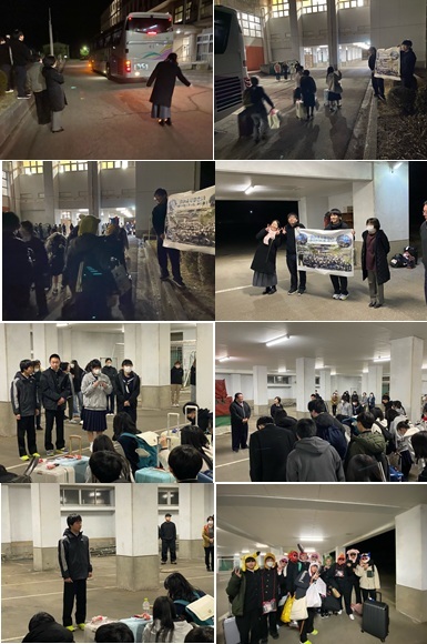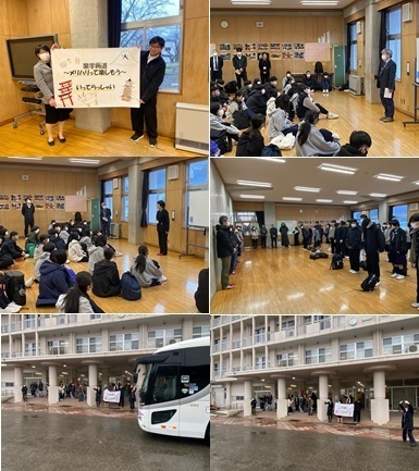 驚きの雪がちらつく寒い朝でしたが多くの保護者の方から見送られ、大きな荷物をもって元気に集合しました。出発式では、修学旅行実行委員の司会で、学年主任からのお話、お世話してくださる旅行社さんへのあいさつの後、見送りに来てくださった保護者の皆さんへ元気よく「行ってきます」のあいさつをしてくれました。保護者の方からも「いってらっしゃい」と拍手で見送っていただきました。