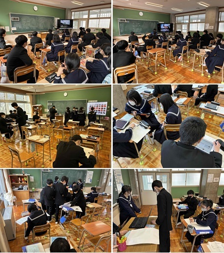 修学旅行を終えた2年生は、朝の学年朝会で改めて帰着式を行い、4名の代表生徒が感想を発表しました。たくさんの学びがあったと同時に、学年集団の成長を実感できたことをそれぞれが発表していました。その後、多くの学びをしっかり整理するために、ポスターセッションに向けた準備活動を行いました。しおりに記入した内容を見直したり、訪れた先のパンフレットを開いたりしながら丁寧に行っていました。また、記録として撮影した写真選定を行うなど、思い出に浸りつつ真剣に活動を進めていました。