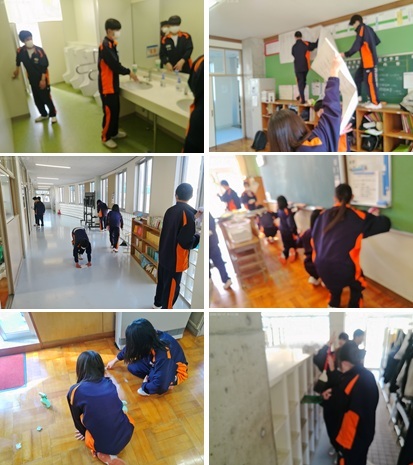 1・2年生が学活の時間を使い年度末大感謝清掃を行いました。この1年間、共に笑い、共に学んだ教室や廊下をはじめ、トイレや下駄箱などにも感謝の気持ちを込め、普段の清掃では行き届かない場所まで重点的にきれいにしました。掲示物がなくなった教室や廊下は、ちょっぴり寂しい感じもしますが、それぞれの学年が先輩として次の学年にしっかり引渡す準備ができました。