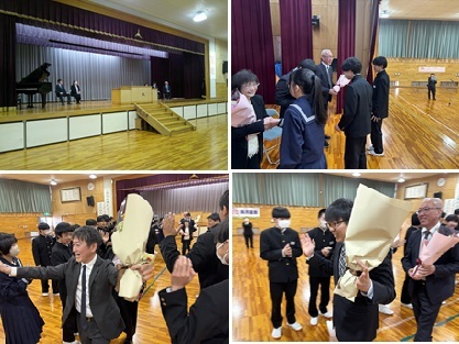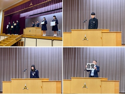 23日(火)に3学期終業式を行いました。式の前には、各種大会や検定の表彰を行い、皆で健闘を称え合いました。各種検定に積極的にチャレンジする生徒が多いことを改めて実感しました。終業式では、1・2年生の代表生徒が3学期の振り返りと新年度に向けた目標を発表しました。個人として挑戦したことと自分なりの成長、学級や学年の集団としての成長など、それぞれの視点でしっかりと振り返り、それをもとに新年度に向けた新たな目標について、力強く堂々と述べました。