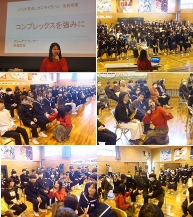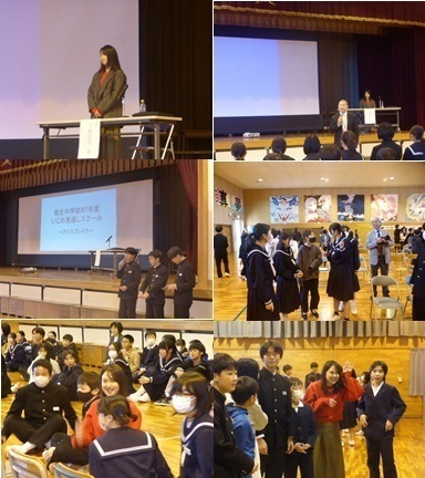 19日(金)、1・2年生合同集会を開催しました。次年度の生徒会組織づくりに向けた内容で、新二役からは、目指す学校像や公約の再確認が行われ、協力してほしいことや積極的な参加を呼びかける熱い思いが伝えられました。また、現総務委員や専門委員長の3年生からは、活動内容ややりがいが語られ、よりよい学校づくりをしっかり引き継いでほしいというエールが送られました。新総務委員・専門委員長選出に向けた面接は、新年1月に実施予定です。同日、3年生のKYB活動を行いました。糸魚川市教育委員会スクールソーシャルワーカーの細井 広子 様を講師にお迎えし、「自分との向き合い方」をテーマに御講演いただきました。受検を控える3年生にとって、まさに「自分事」となる内容で、生徒たちは大きくうなずきながら、真剣にメモを取り、話に耳を傾けていました。講演を参考に、これからの数か月、自分と上手に向き合って過ごしてほしいと思います。