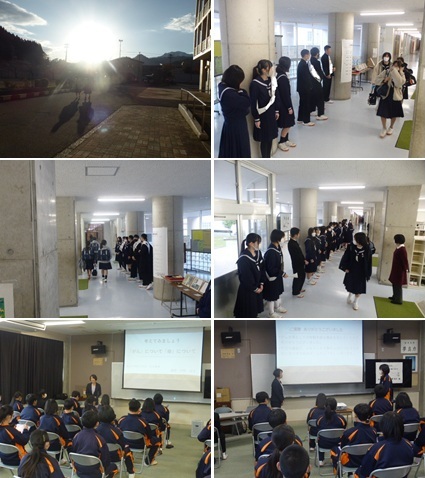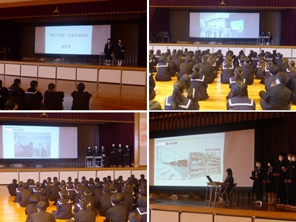 全校朝会で、市の派遣事業に参加した生徒による報告会が行われました。派遣事...