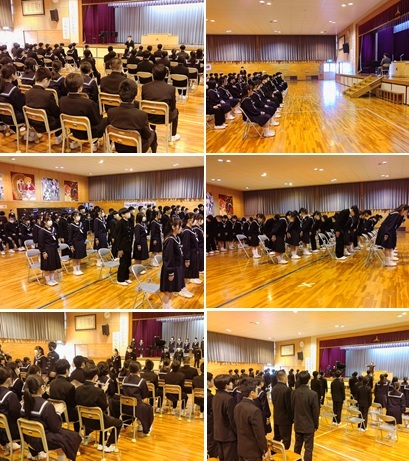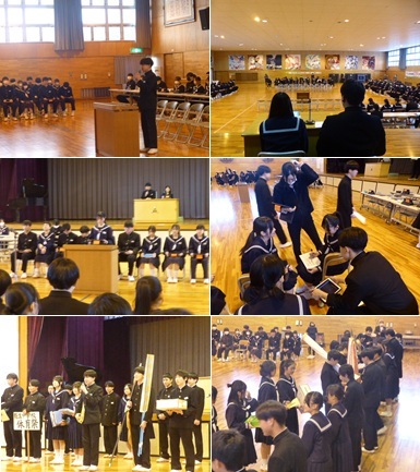 23日(火)に3学期終業式を行いました。式の前には、各種大会や検定の表彰を行い、皆で健闘を称え合いました。各種検定に積極的にチャレンジする生徒が多いことを改めて実感しました。終業式では、1・2年生の代表生徒が3学期の振り返りと新年度に向けた目標を発表しました。個人として挑戦したことと自分なりの成長、学級や学年の集団としての成長など、それぞれの視点でしっかりと振り返り、それをもとに新年度に向けた新たな目標について、力強く堂々と述べました。
