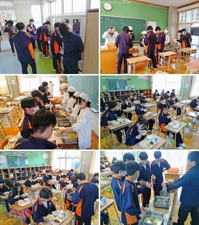 令和7年度も残すところ1週間となりました。来週23日(月)は3学期の終業式、そして1年の修了日となります。今週は4日間と短く、3学期やこれまでの1年間を振り返えってまとめを行い、次年度に向けての準備をする最終期間で、とても忙しい毎日となります。そんな中でもホッとするのが給食の時間。皆で協力して配膳や後片付けをして、おいしくいただきます。今日のメニューは、五目うま煮丼・ツナ入りバンサンスー・チーズ・牛乳。1・2年生ともに、おいしい給食を食べ、「ホッ」と一息という様子でした。給食も残り1週間。たくさん食べて残りの日数も元気に過ごしてほしいです。