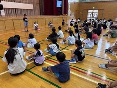 今回の交流活動の計画・準備は、当校6年生がすべて担当し、相手校の6年生を迎え入れました。はじめに、全員が大きな輪になって座り、交流のスタートを切ったのは「なんでもバスケット」。鬼になった児童は、「名前」と「生年月日」を自己紹介として伝えることがルールです。「靴を履いている人!」