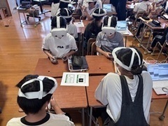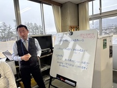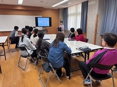 当校職員は、5・6年生がVRを用いて外国語活動に取り組む授業の様子を参観しました。また、職員自身も実際にVR機器を装着し、子どもたちと同じ体験を行いました。多くの職員にとって初めて触れるICTツールであったことから、「どのように教育活動へ生かしていくのだろう」という期待や、「いよいよこうした時代が学校現場にも本格的に訪れつつあるのだ」という驚きなど、さまざまな思いを抱いた様子がうかがえました。報告会では、VRや生成AIはあくまでも“手段”であり、授業の目的が何より重要であるという点が改めて示されました。また、「VRも生成AIも、人とコミュニケーションをするための練習にすぎない」という児童の振り返りが紹介されると、多くの職員が深くうなずきながら聞き入っていました。新しい技術に触れたことで学習の本質や子どもたちの気づきが一層胸に響く報告会となりました。