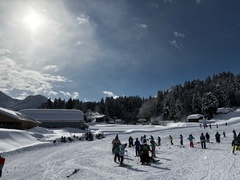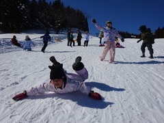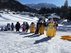 前日からの冷え込みでスキー場の斜面はやや凍って硬く締まり、ソリの滑りはいつも以上にスピード感満点。勢いよく滑り降りるたびに歓声が響き、子どもたちの興奮は最高潮に達していました。