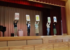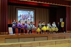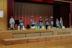 プログラム2番3年生 「早川戦隊フラワーレンジャー」総合的な学習で、早川のいいところを見つけてきました。学習するうちに、早川には四季を通じて素敵な花がたくさんあることに気付きました。春は藤の花、夏は早川大花火、そして宙を彩る蛍たち、秋はざる菊。早川の素敵なところが伝わるように、台詞の言い方や体の動かし方を相談しながら練習してきました。
