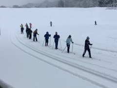 1月14日(水)は、今年度はじめてのクロスカントリースキー練習でした。時折雪が舞う中、子どもたちは元気に会場に向かいました。身支度を終えて、準備体操。ジュニアスキーの子どもたちがリーダーとなって進めていました。