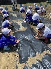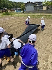 作った畝にマルチをはりました。昨年さつまいもを育てた時にもあったそうで、その時はどうしたのか尋ねると「知らないうちにはってあった!」とのこと。今年は「自分たちではる!」と言うので、みんなでやってみました。ここにも、成長している2年生の様子がうかがえました。 マルチを持つ人と、マルチ押さえをさす人とで交代しながら全員で力を合わせて頑張りました。「腰が痛い~」と、農家さんの苦労を味わいながらも、上手にはり終えることができました。