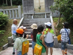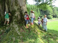 最後に、大ケヤキのところへ行き、樹齢約300年、幹の周囲は7.3m、木の高さは26mという、その大きさを実感しました。昔、「山王社」があったから「山王森」ということも教えていただきました。 木陰で涼しく、ここでもさわやかな風を感じることができました。「ここでお弁当食べたらいいね。」なんて声も聞こえてきました。